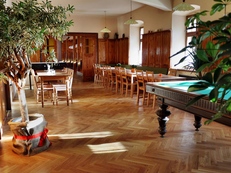 Inside the cottage: entrance hall, living room with equipped bar (TV + SAT, professional draft beer equipment billiard, table football, tables, chairs, benches), dance hall with boxes, tables and benches (fee for its use: 5.000,-CZK/stay), kitchen (kitchen countertop, 4x fridge, 2x electric stove, 3x oven, el. hotplate, drip coffee maker, 2x toaster, 2x microwave, 4x el. kettle), sanitary facility for men (4x urinal, 2x toilet, 1x wash-basin), sanitary facility for women (3x toilet, 2x wash-basin) ski and bike storage room.