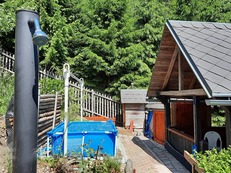 By the house: large front garden, small pond (no fishing!), spacious seating area with fireplace, seating "bell", parking by the house, above-ground swimming pool (approx. 2,5 x 4 m), sandpit. Parking: next to the house (spring to autumn for 3 - 4 cars, in winter when there is snow cover approx. 100 m).