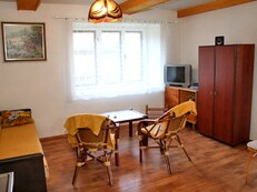 By the cottage: smaller garden (court) with sitting, back side of court pets (chicken, cock, rabbits) fed by owner. Behind the cottage park with fallow deer, meadows, forests, private fishing (1,5 km). Arround: tennis court 2,5 km, fitness, suqash, sauna, disco: 8 km, recreation area near to Giant Mountains, golf Mladé Buky 20 km, swimming: 4 km (swimming pool Dolní Kalná), indoor swimming pool: 13 km, ski-lift: 14 km, ski areal Herlíkovice and Černá Hora 25 - 29 km, ski areal Špindlerův Mlýn 29 km, restaurant: 500 m, shop: 1 km, train station: 1,5 km, bus station: 200 m.