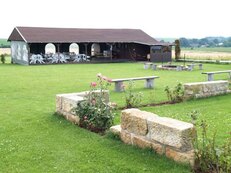 By the hotel: grassed space, playground, fire ring, grill, terrace, parking.
